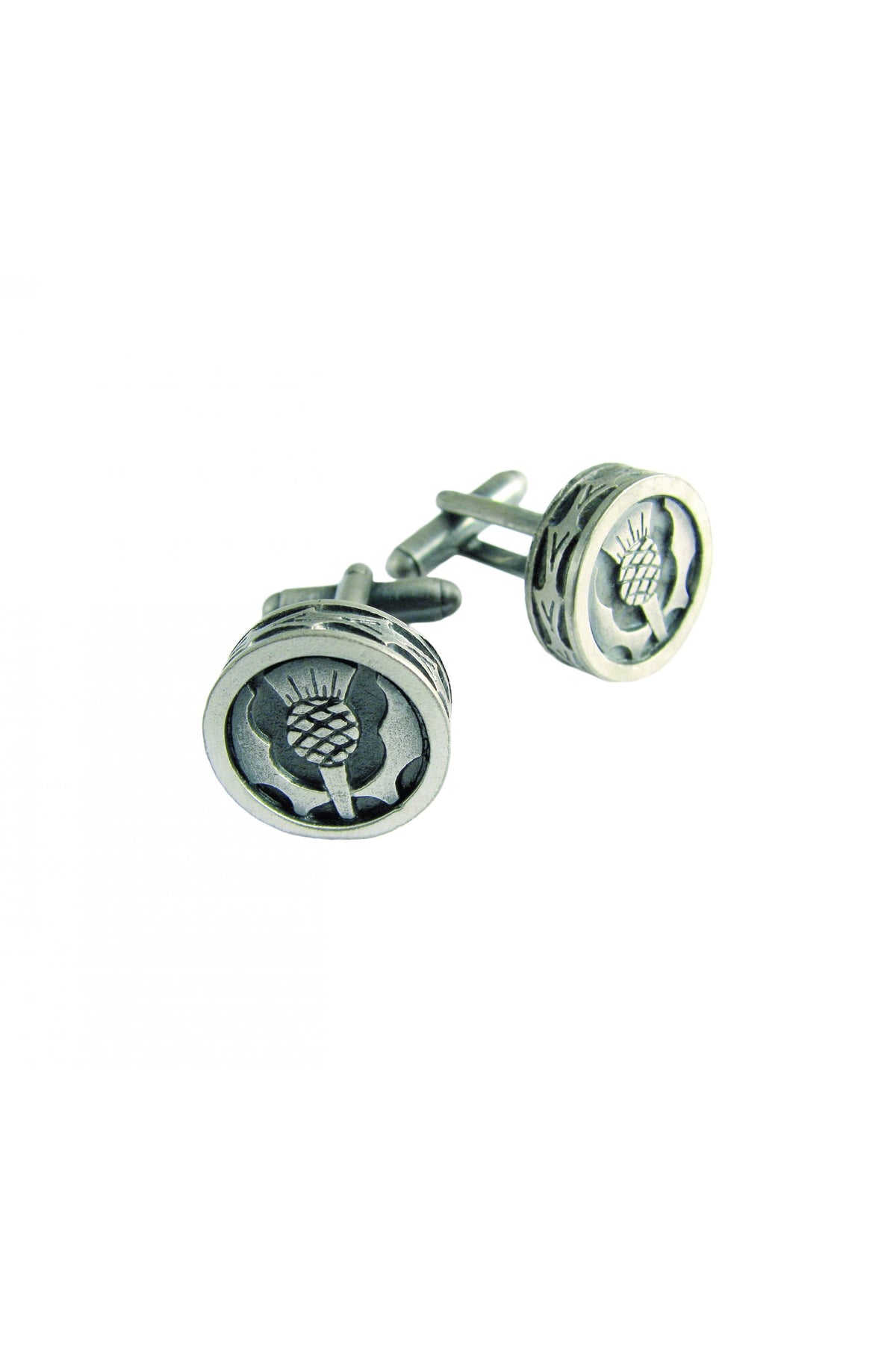 This set of round cufflinks crafted in a matt pewter features a thistle on a black background, highlighting the details of the design perfectly.