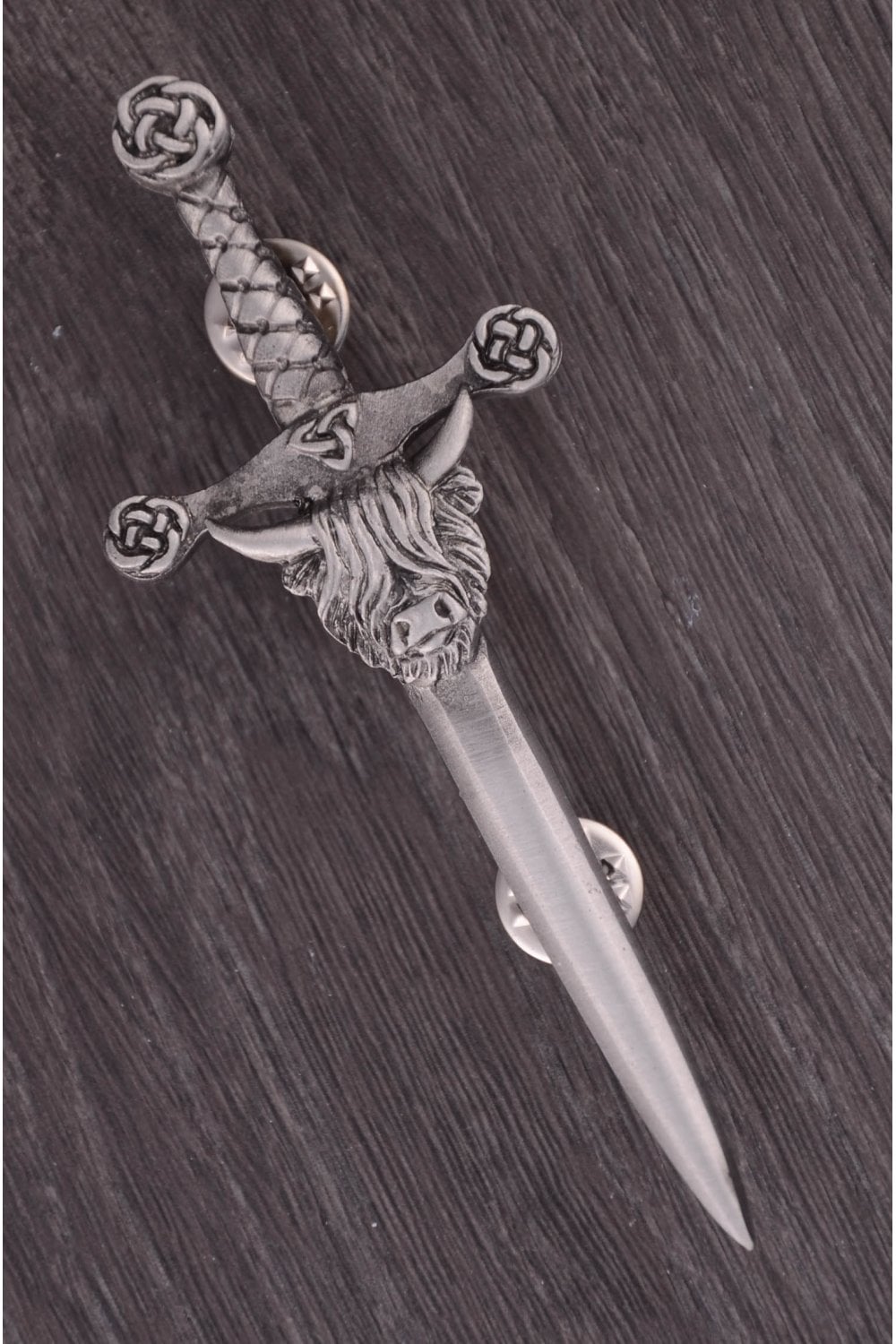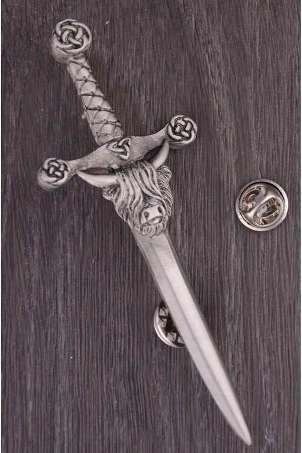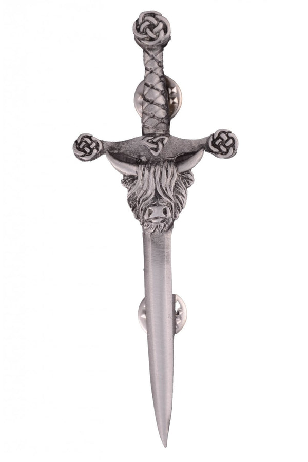 Showcasing a majestic highland coo at the top of the blade of an antique pewter sword. The intricate details of the coo, coupled with Celtic swirls adorning the hilt, add a touch of sophistication and symbolism to this accessory.