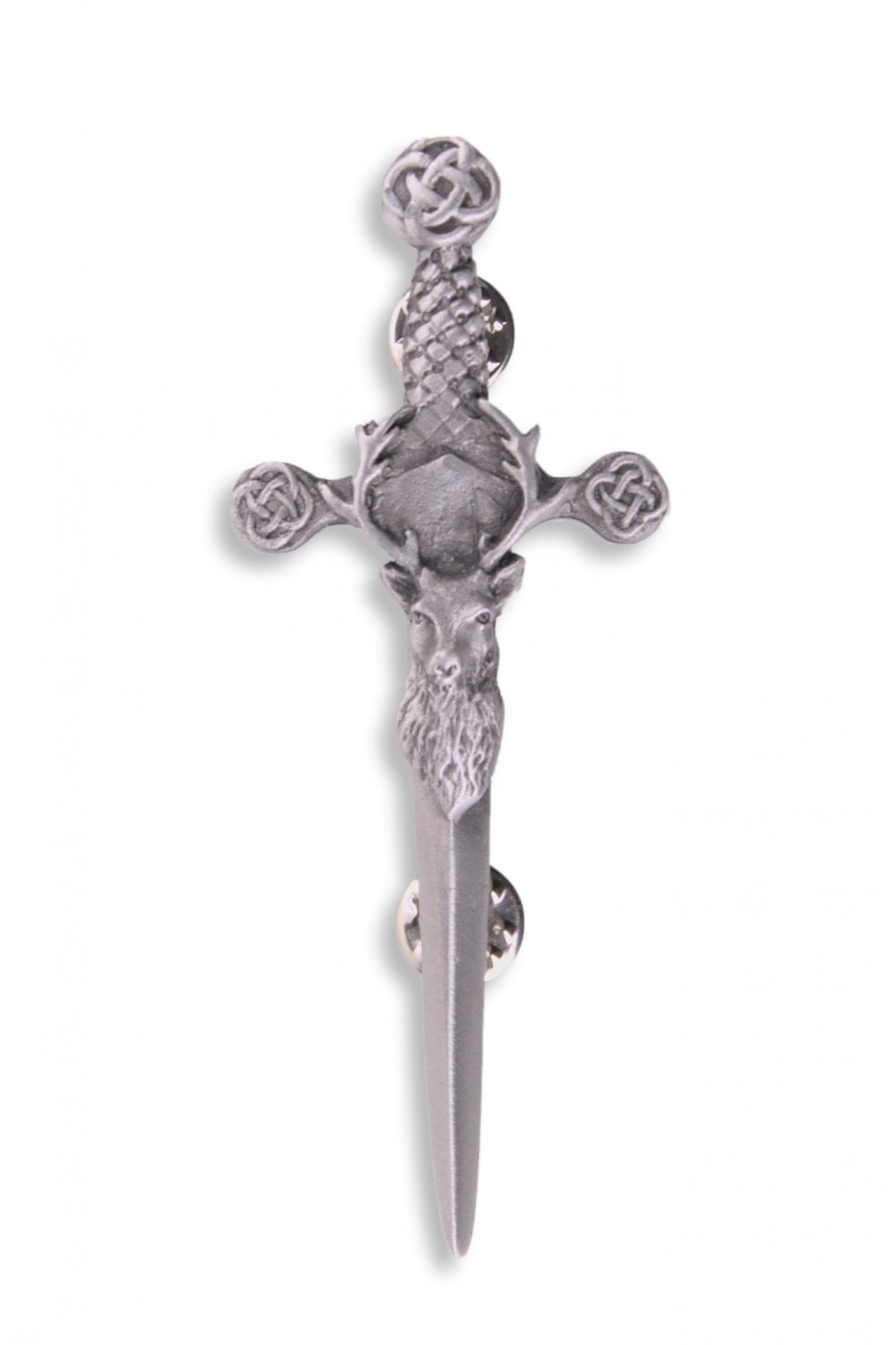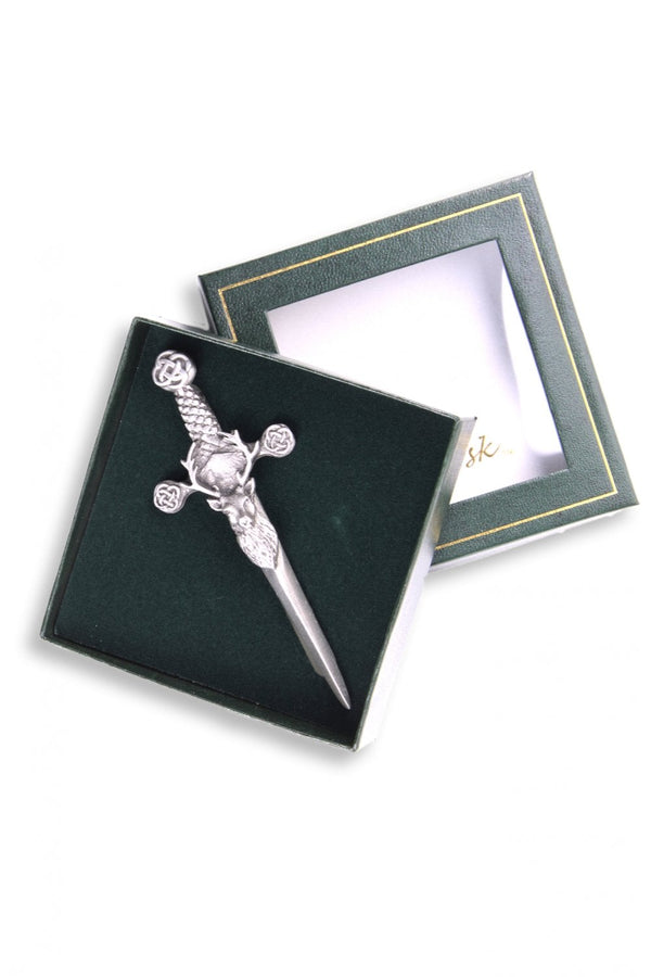 The focal point of this kilt pin is a finely detailed claymore, its blade proudly displaying the regal staghead. Constructed from high-quality pewter, the pin exudes sophistication with its antique finish, creating a distinctive and refined appearance.