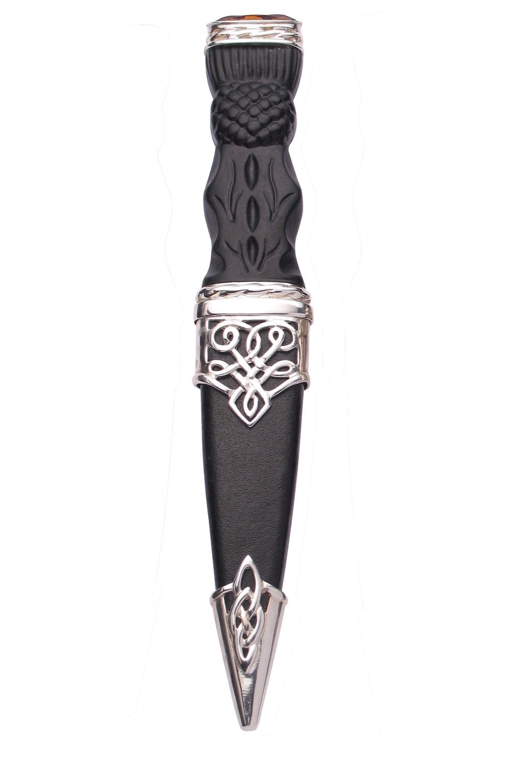 This Sgian Dubh is top of the range when it comes to elegance and quality of materials used during manufacture. The stainless steel blade is 87mm long and is encased in a leather bound scabbard. The sterling silver design on the leather bound scabbard features an interlaced Celtic design and the top of the handle is mounted with sterling silver, creating a striking ornate finish that you will be able to see when worn. The hilt is hand-carved in Scotland and hallmarked in Edinburgh, this elegant Sgian Dubh is a fantastic addition to your kilt outfit.