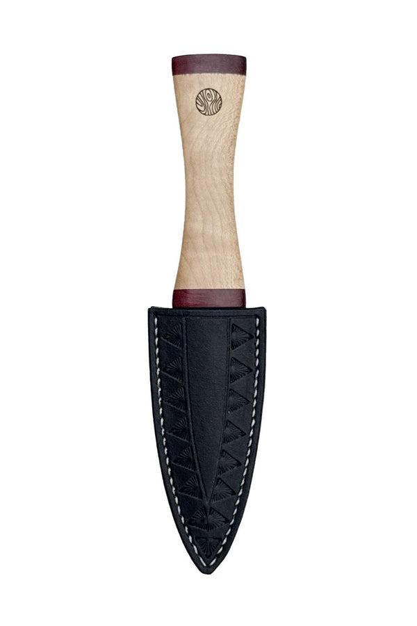 This Sgian Dubh features a striking handle crafted from Sycamore and Purpleheart wood, a combination that highlights the contrast between the pale warmth of Sycamore and the rich, vibrant tones of Purpleheart. Paired with a premium Wild River Forge blade and a sleek black leather sheath.