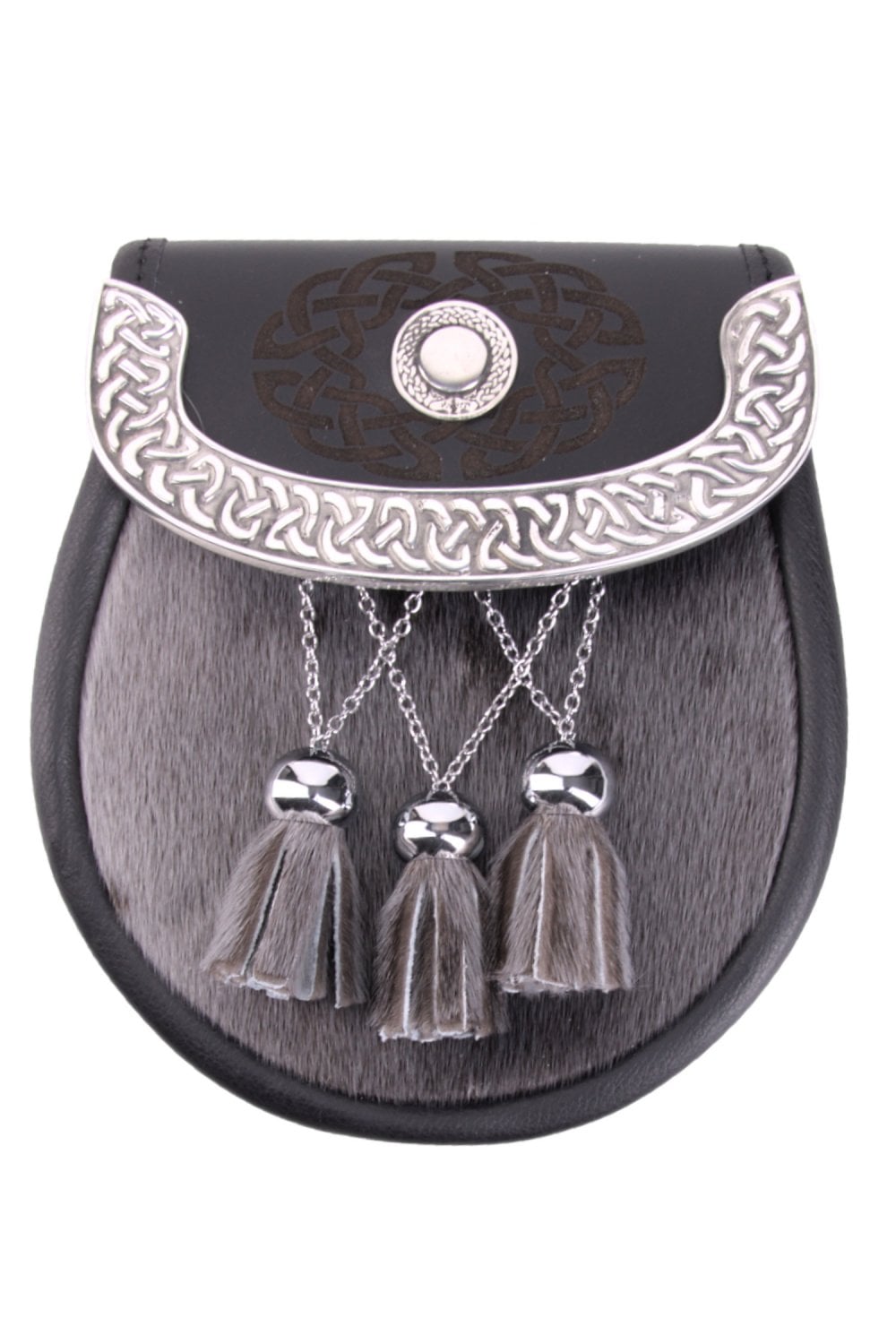 This semi dress sporran, handcrafted in Scotland from real leather hide and skin, will surely get heads turning! Its mid-grey seal skin front is detailed with three cross chains and bells for a bit of added flair. To top it off, The sporran also displays a Celtic inspired disc badge that has been surrounded by an intricate engraving of Celtic knot work. It is sure to add a touch of tradition and style to any highland outfit.