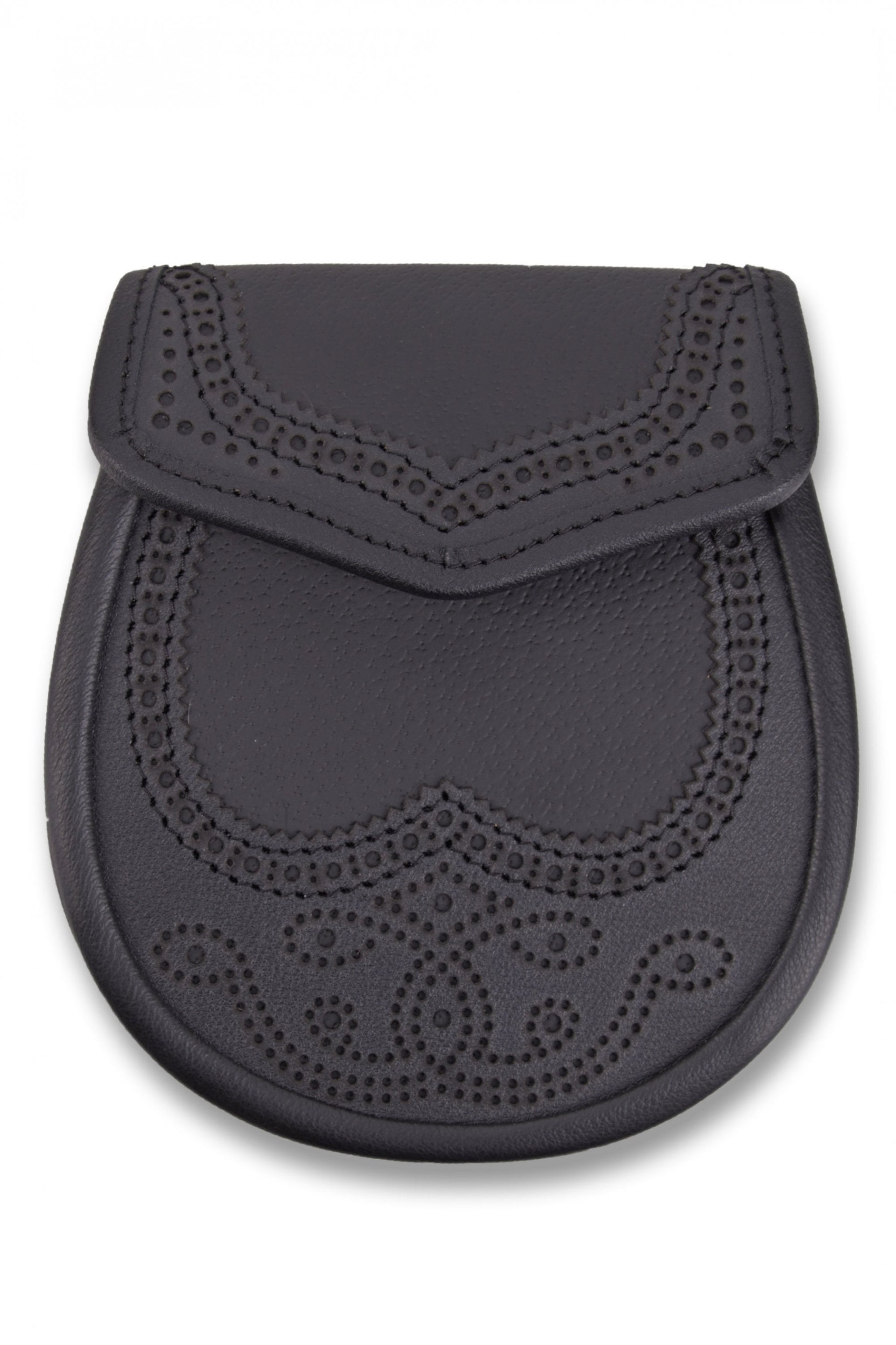 Introducing our exquisite black leather day sporran, a must-have accessory for any discerning Scotsman. Handcrafted by skilled artisans in Scotland, this sporran is the perfect blend of elegance and functionality. The intricate brogue pattern adds a touch of sophistication to the classic design, making it a standout piece.