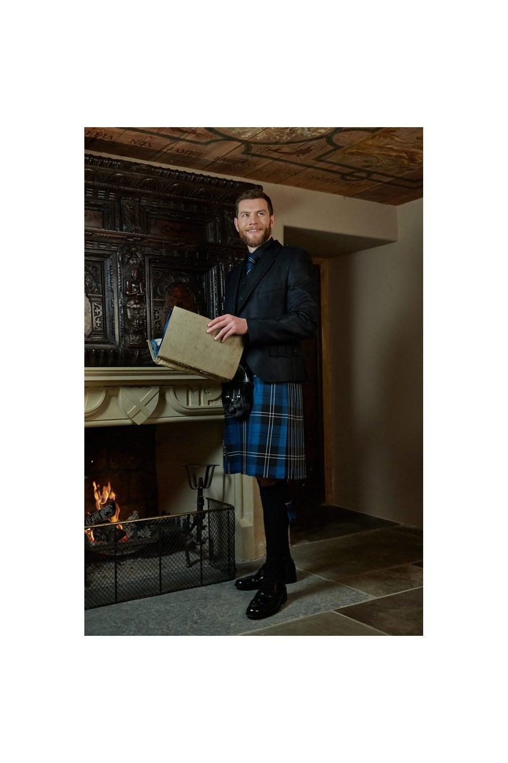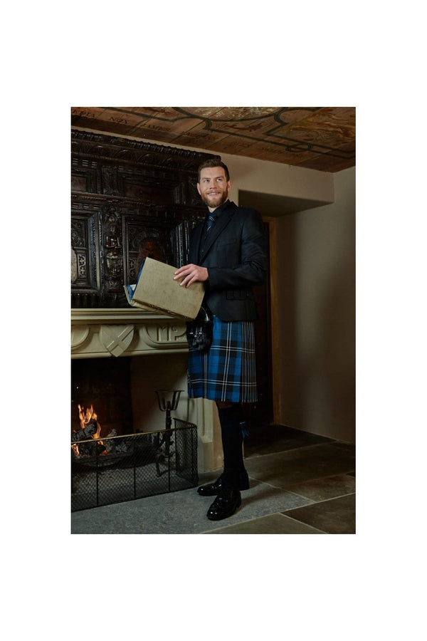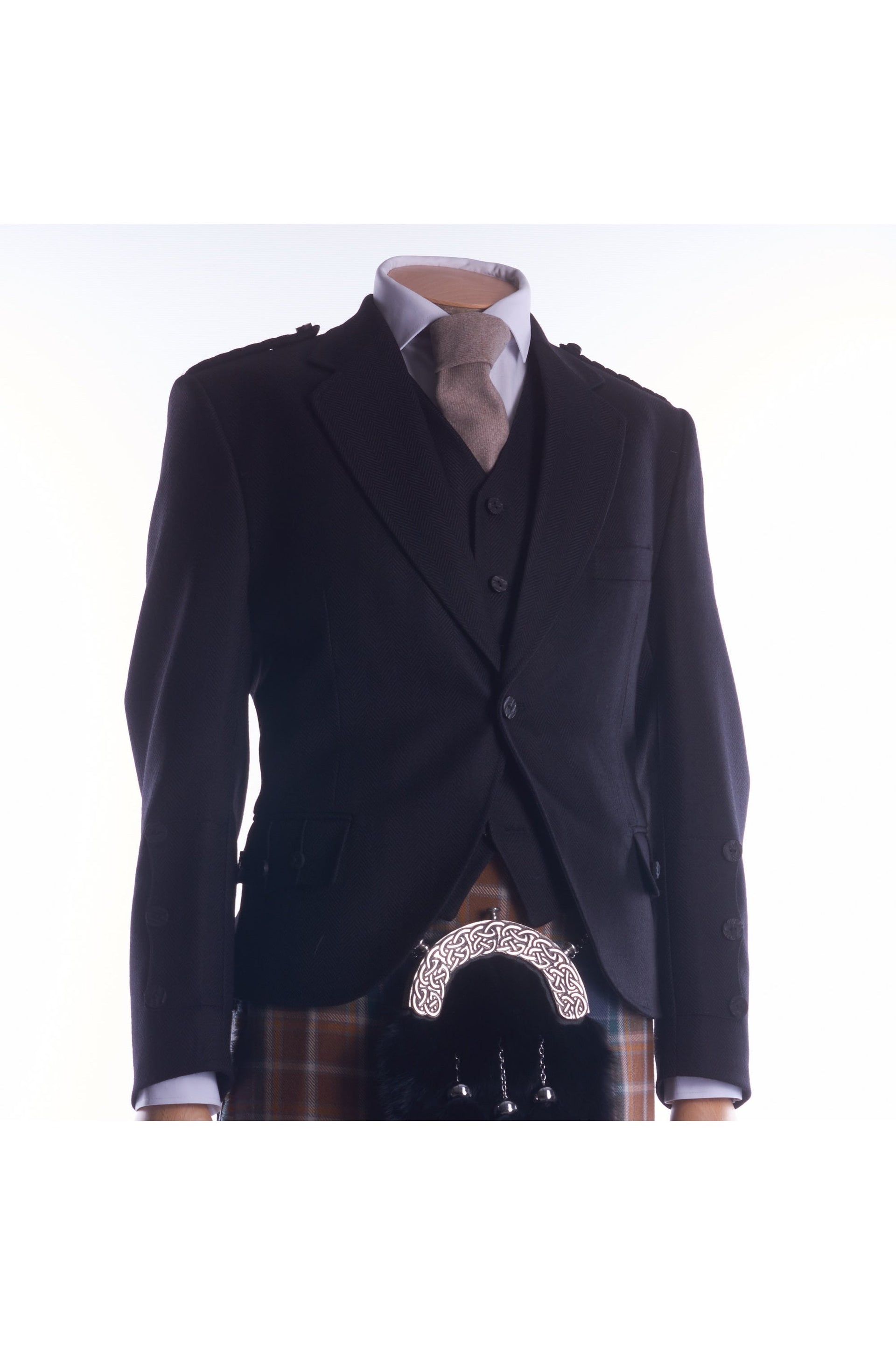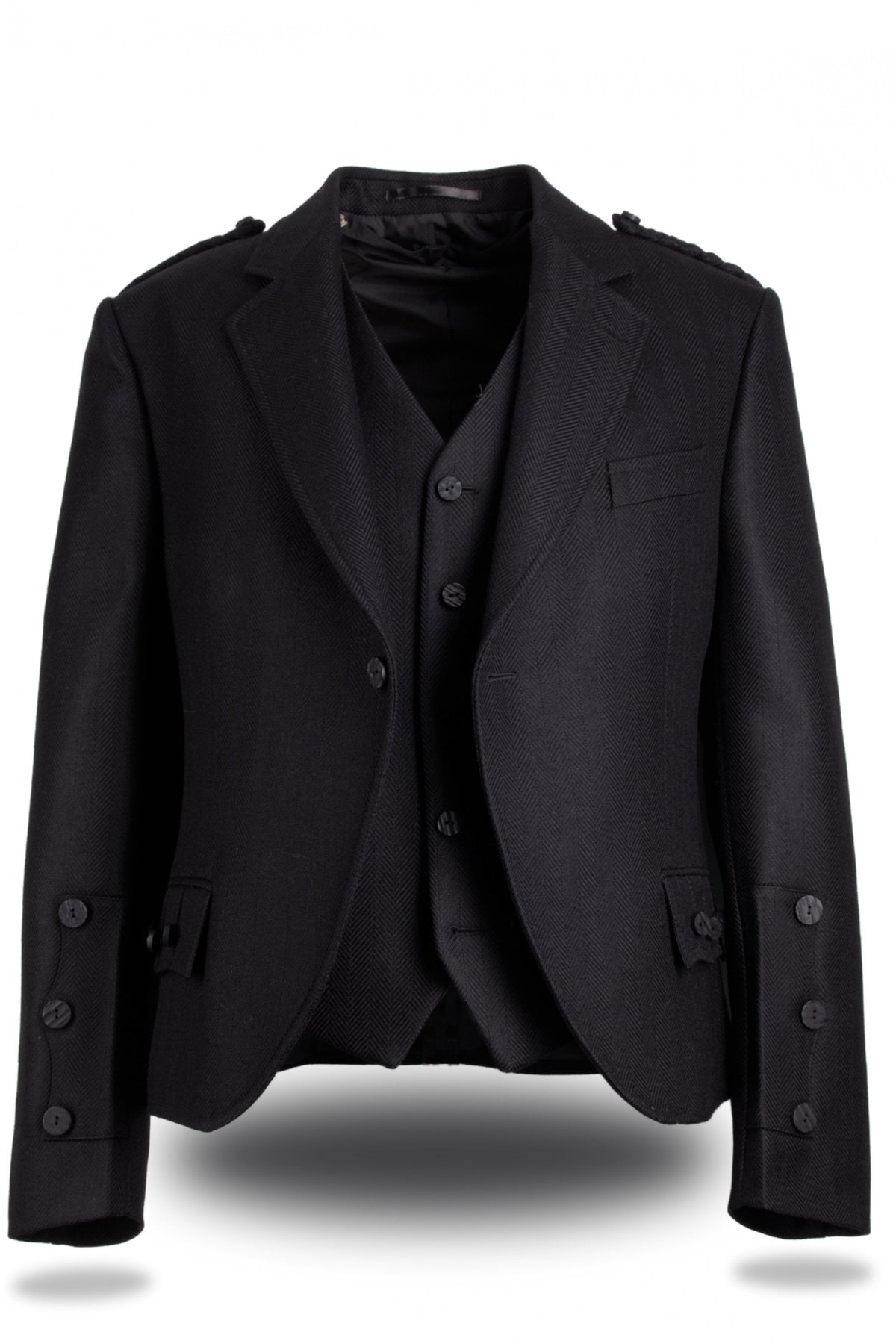 A single button jacket featuring Prince Charlie cuffs, plaited epaulettes and a high-neck 5 button waistcoat, both trimmed with imitation staghorn buttons. Made from 100% pure new wool herringbone fabric.