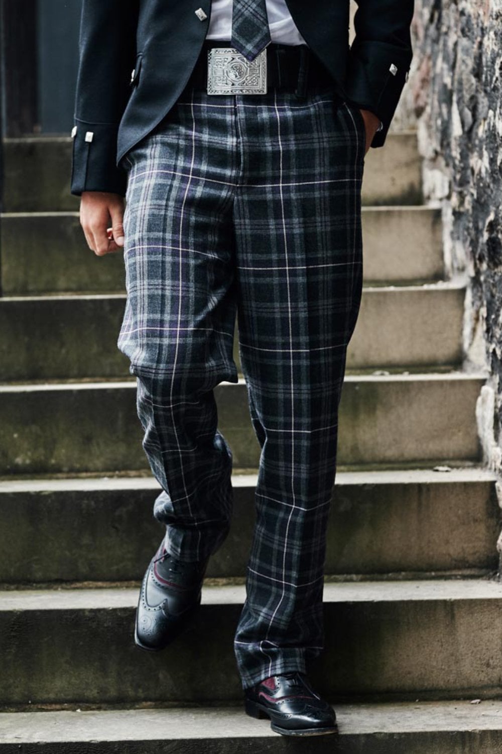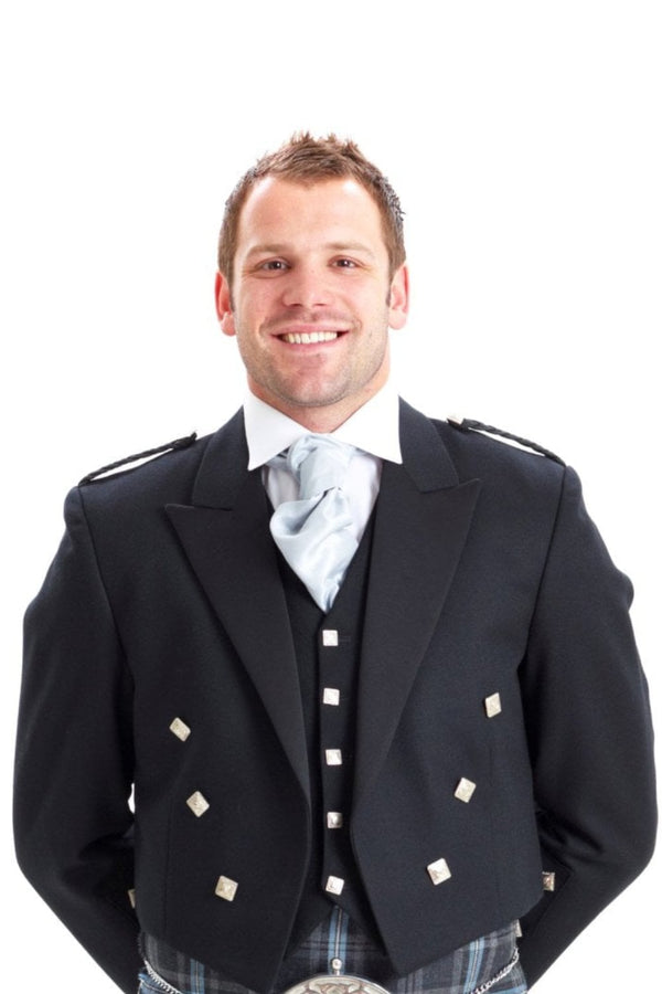This classic short cut jacket with tails at the back is made from barathea wool. The timeless design features chrome buttons, twisted epaulettes, satin lapels and a five-button waistcoat with a satin back and rear cinch belt. Being a traditional jacket made in black wool allows this to be worn with any of our tartans.
